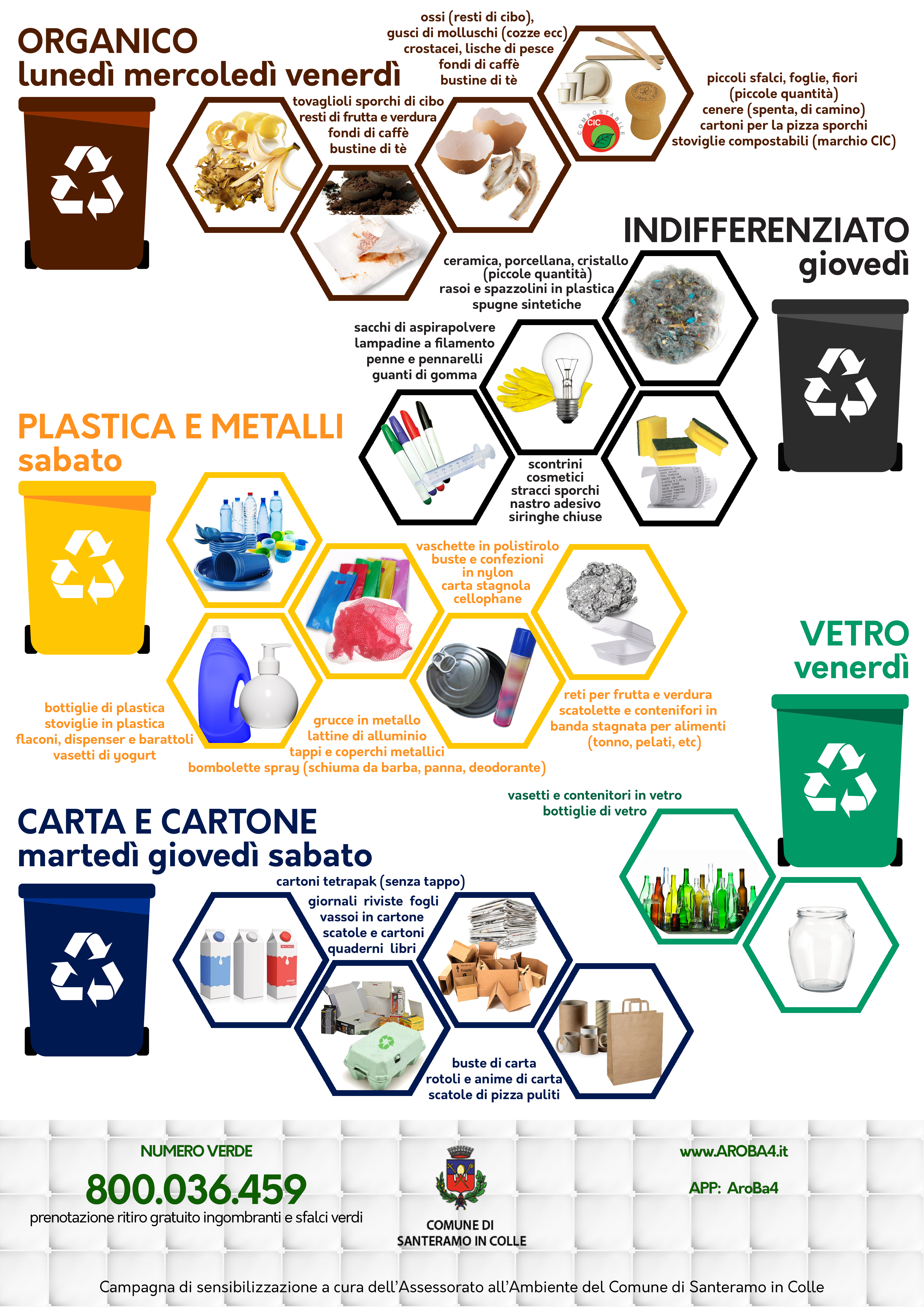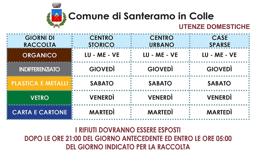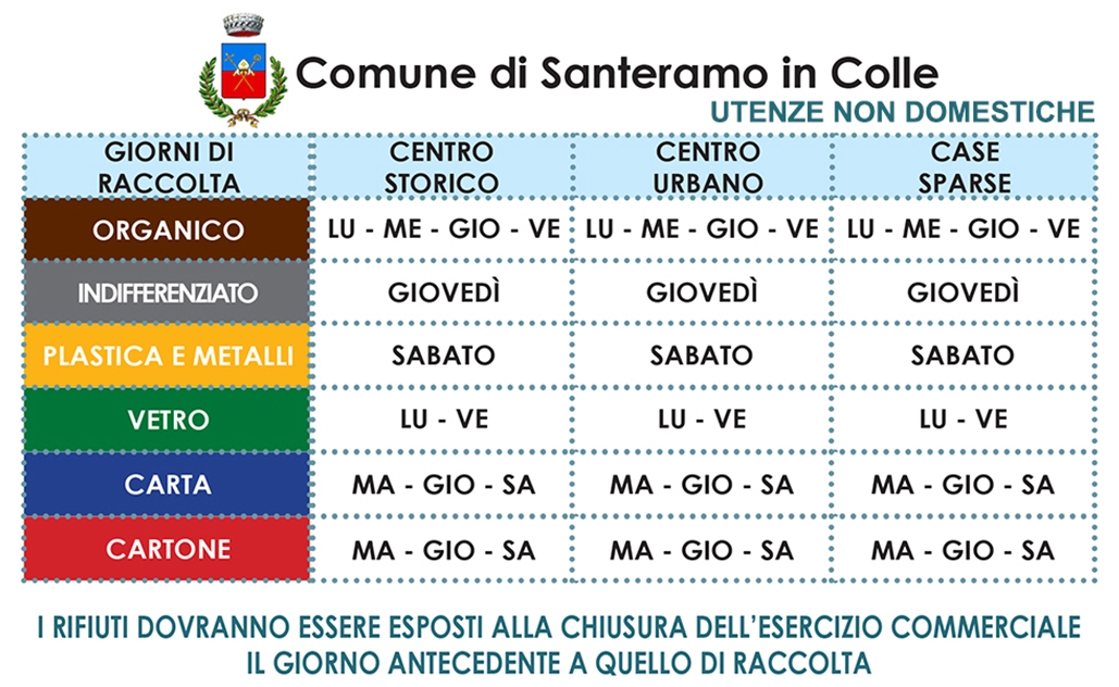 - Calendario 2018 Utenze Domestiche- Calendario 2018 Utenze Non Domestiche- Modulo Raccolta Pannolini e Pannoloni- Informativa Raccolta Pannolini e Pannoloni- Locandina Raccolta Differenziata- Orari di Apertura CCR Centro Comunale di Raccolta (Isola Ecologica)- Modulo richiesta sostituzione pattumella rifiuti
